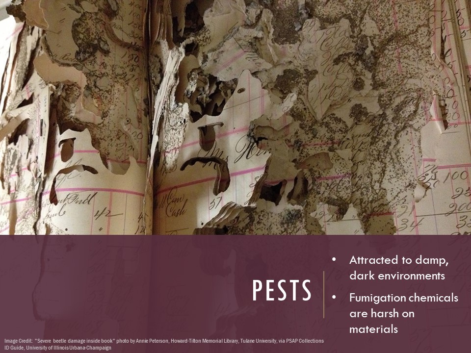 Not all insects will directly eat collections materials; the most common damaging ones include silverfish and the literal bookworm, which is a beetle in its larval stage. The above image shows the damage of a bookworm infestation.